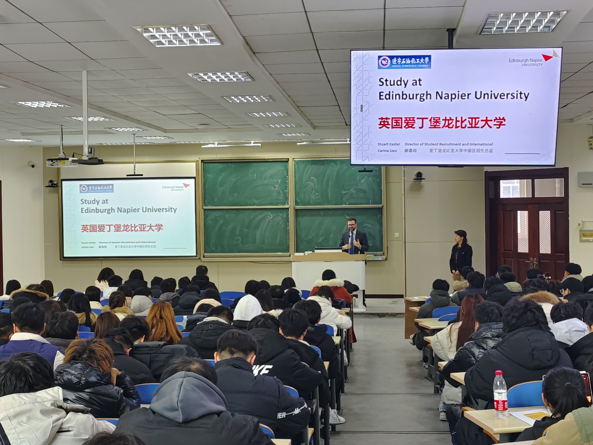 下午,在教四A102教室,Stuart Easter一行就愛丁堡龍比亞大學學校介紹及兩校校級交流項目介紹舉辦了宣傳講座,全校兩百余名學生聆聽講座。講座結束后,學生們踴躍咨詢校際交流項目相關問題。此次宣講使更多學生了解與愛丁堡龍比亞大學進行校際合作的具體內容及申請流程。