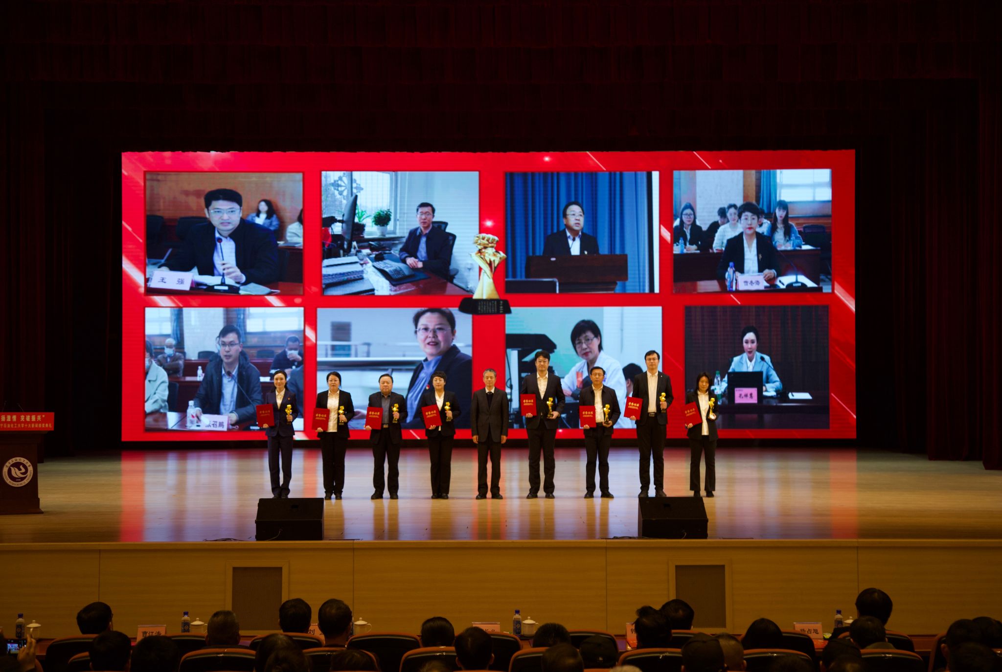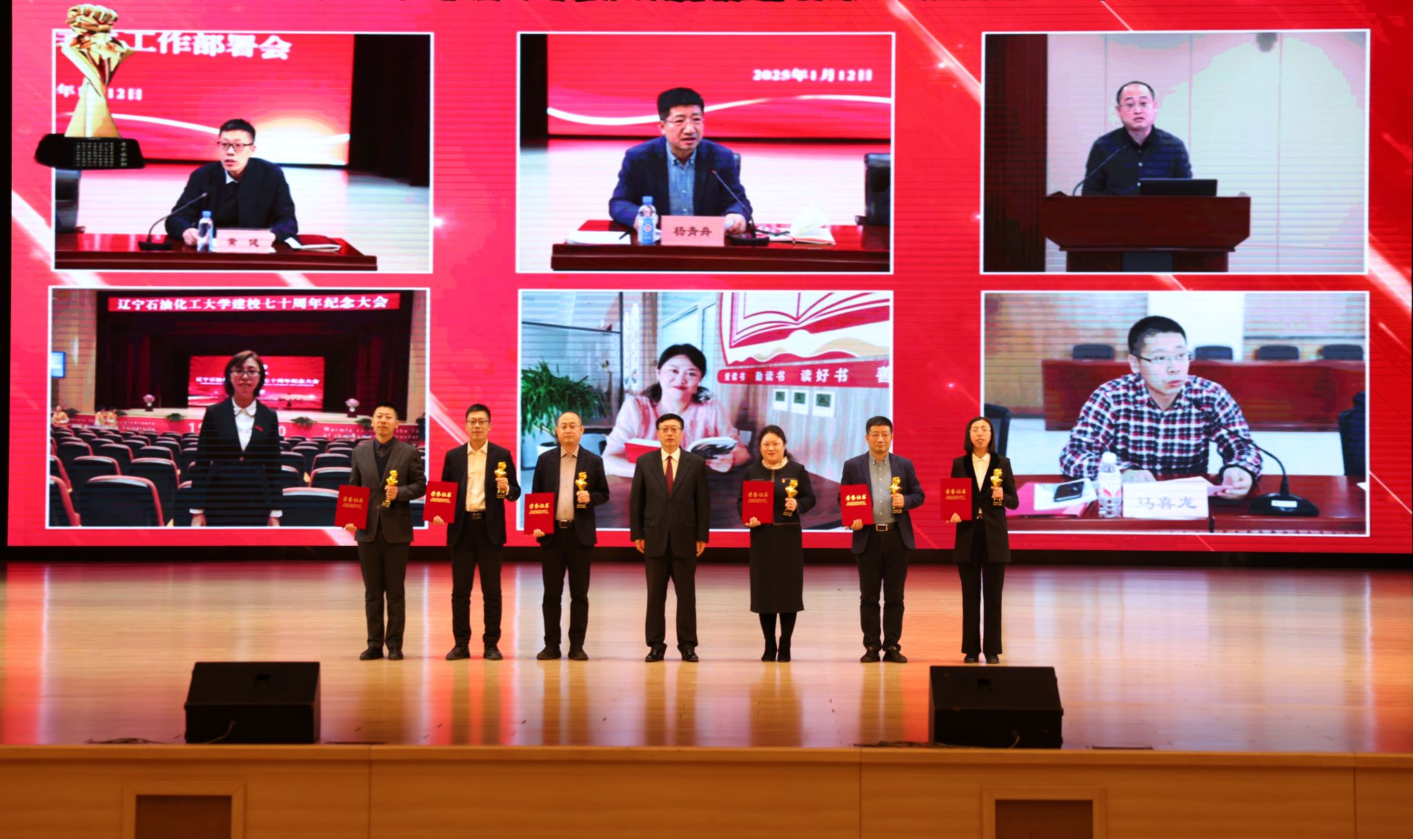 在頒獎典禮上,依次以視頻形式公布了十大新聞,宣讀了頒獎詞及獲獎名單。校領導依次為十大新聞獲獎者頒獎。在獲獎代表發(fā)言環(huán)節(jié),黨委組織部王強、發(fā)展規(guī)劃處李焱斌、石油化工學院王吉林、繼續(xù)教育學院趙俠、招生就業(yè)辦公室趙曉東、后勤集團黃春雷6位代表,分享了他們的感受與決心,表達了對學校發(fā)展,尤其是增列博士授權單位關鍵目標的美好期許。他們立足崗位講奉獻、勇于創(chuàng)新求突破、腳踏實地踐使命、聚焦要事談展望,以一張藍圖繪到底、一鼓作氣不松勁的決心銳意進取、篤行實干,詮釋著“問學穿石,修身誠化”的校訓精神,展現(xiàn)著遼石化大人的堅韌與智慧。