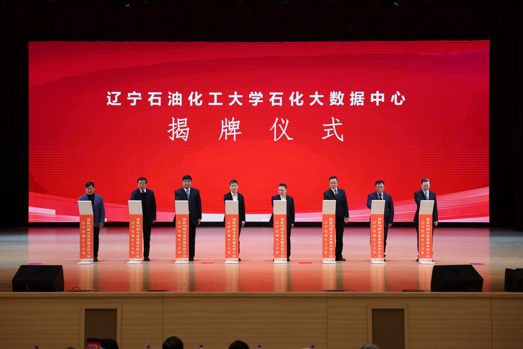 大會總結學校75年發展成果與能源報國實踐,錨定“數字遼寧 智造強省”戰略,以石化大數據中心建設為依托,推進博士授權單位創建,向能源領域特色鮮明的一流高水平應用型大學目標邁進。會上,學校與10家高校、企業簽署戰略合作協議,省科技廳副廳長張海波、省工信廳副廳長翟德懷、撫順市副市長張君昶、中國地質大學(北京)副校長段翔、遼寧省化工學會理事長孫云、大連西太平洋石油化工有限公司董事長何晨光、中國石油大連石化公司總經理花小兵等10位領導嘉賓共同為校際校企合作揭牌,標志著各方將在人才培養、科研創新等領域展開深度合作。
