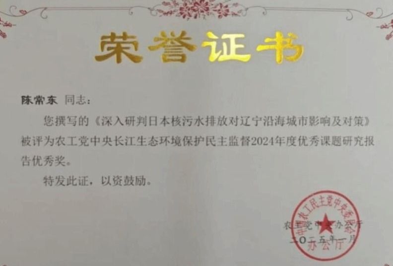 近日,中國農工民主黨中央委員會公布了《關于農工黨中央長江生態環境保護民主監督2024年度優秀課題研究報告的通報》及《關于2024年度優秀調研報告評選結果的通報》。我校農工黨黨員、撫順市政協委員、石油化工學院陳常東副教授所撰寫《深入研判日本核污水排放對遼寧沿海城市影響及對策》調研報告榮獲“農工黨中央長江生態環境保護民主監督2024年度優秀課題研究報告”優秀獎。