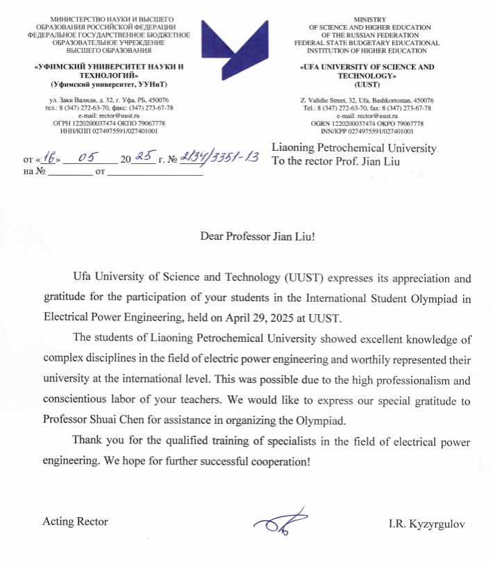 近日,俄羅斯烏法科技大學校長伊?拉?克孜爾古洛夫特向學校黨委副書記、牽頭負責行政工作副校長劉堅發來信函,對我校學生于2025年4月29日參加在烏法科技大學舉辦的國際電力工程奧林匹克競賽表示衷心感謝。