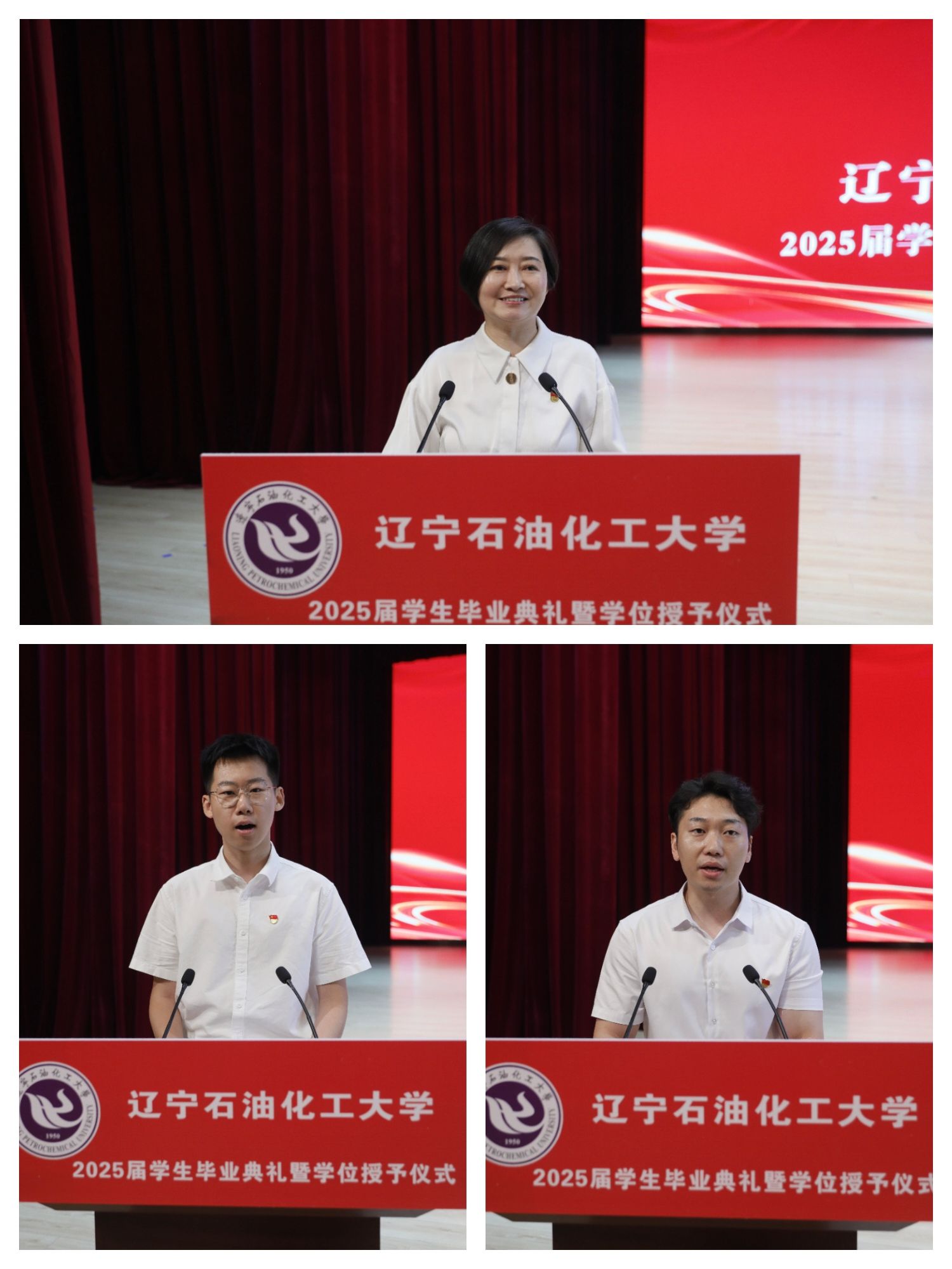 教師代表、第五屆全國高校教師教學創新大賽遼寧賽區一等獎獲得者史春薇教授發言,她用真摯的話語為畢業生送上美好祝福,字里行間滿是對學生的不舍與牽掛;畢業生代表、國際教育學院電外2101班劉子健,馬克思主義學院研2211班張永衡分別發言,他們深情表達對母校和老師的感恩之情,并鄭重承諾將在新的人生舞臺上踔厲奮發,續寫“遼石化大人”的華章,展現新時代青年的責任與擔當。