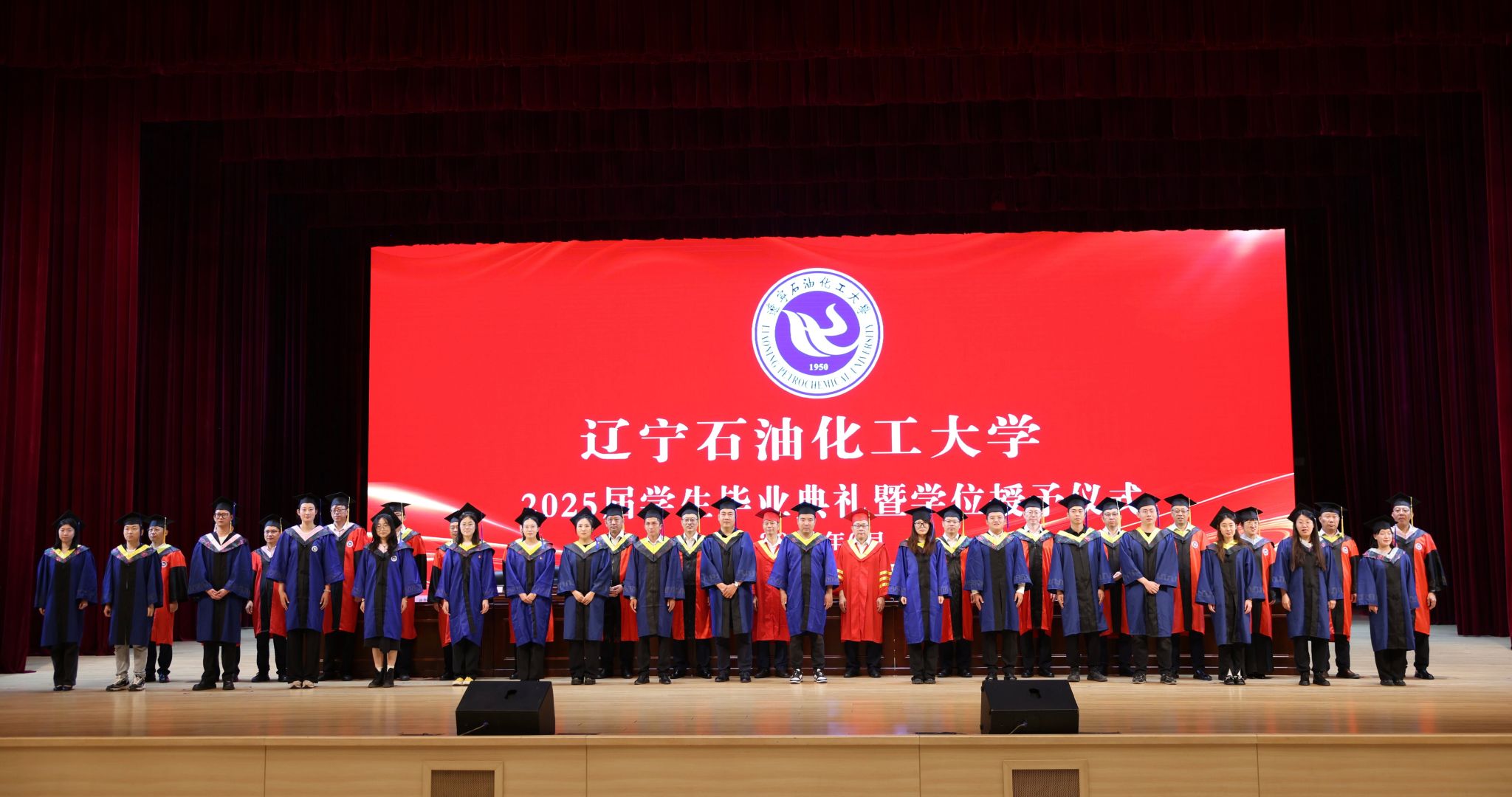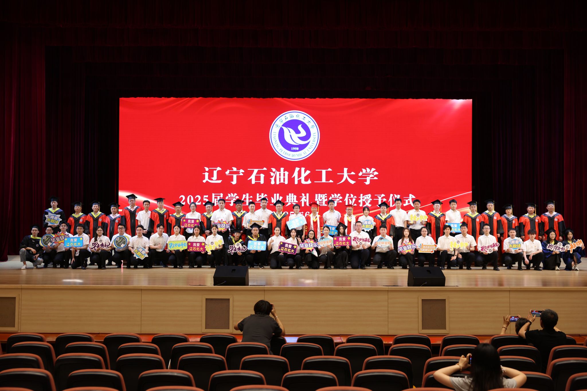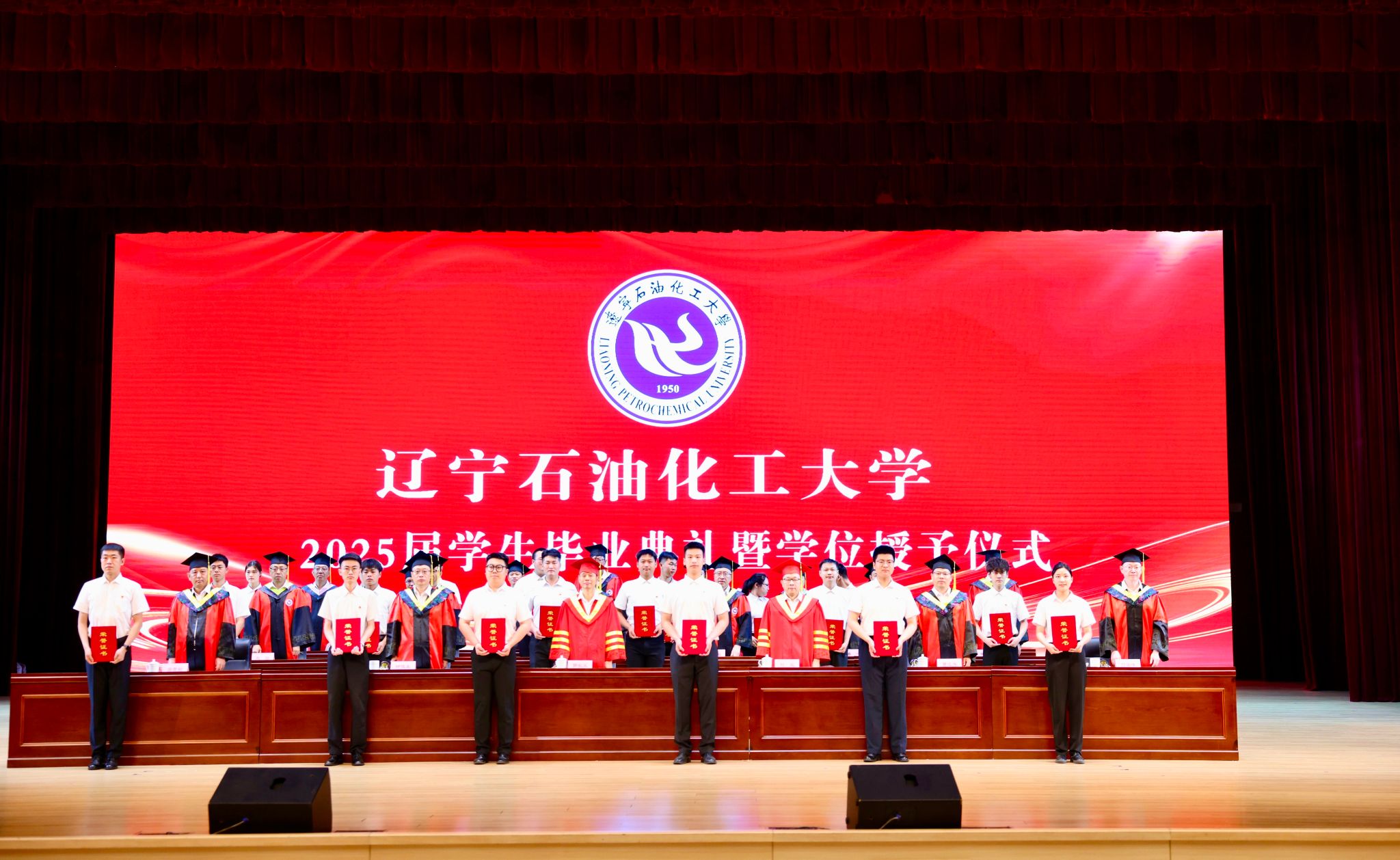 劉海峰宣讀2025屆畢業生“校園之星”表彰決定,授予戰禹諾等25名學生“遼寧石油化工大學校園之星”榮譽稱號。主席臺上領導嘉賓為校園之星獲獎代表頒發獎杯,激勵全體畢業生以榜樣為力量,奮勇向前。
