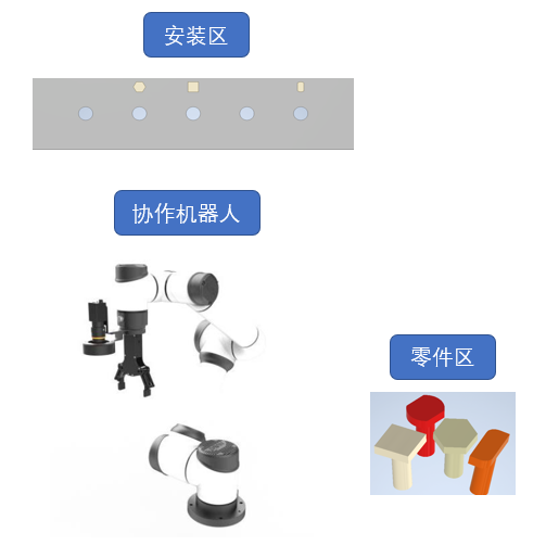四種形狀的零件隨機(jī)放置在零件區(qū)且存在不同程度的傾斜。參賽者需要編制程序,使得機(jī)器人能夠識(shí)別出安裝區(qū)標(biāo)志物的形狀,并在零件區(qū)(圖3)找出對(duì)應(yīng)形狀的零件,依次抓取并安裝至安裝區(qū)標(biāo)志物對(duì)應(yīng)的孔中,由準(zhǔn)確識(shí)別與安裝零件數(shù)量、安裝完成時(shí)間來(lái)進(jìn)行參賽者的打分。