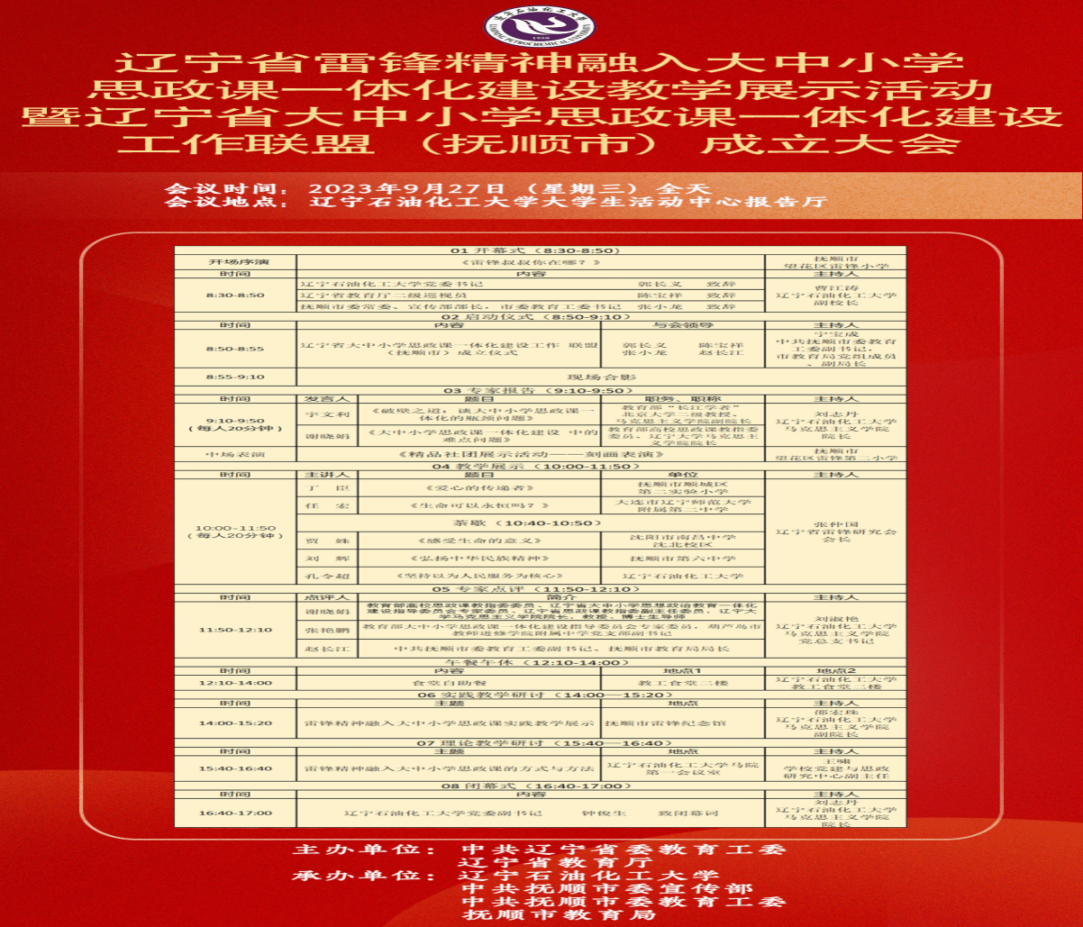 為紀(jì)念毛澤東等老一輩無產(chǎn)階級革命家為雷鋒同志題詞60周年、習(xí)近平總書記在撫順雷鋒紀(jì)念館發(fā)表“9.28”重要講話5周年,深入貫徹習(xí)近平總書記關(guān)于把統(tǒng)籌推進(jìn)大中小學(xué)思政課一體化建設(shè)作為一項重要工程的重要指示精神,學(xué)校將舉辦“遼寧省大中小學(xué)思政課一體化建設(shè)工作聯(lián)盟(撫順市)成立大會”暨遼寧省雷鋒精神融入大中小學(xué)思政課一體化建設(shè)教學(xué)展示活動。