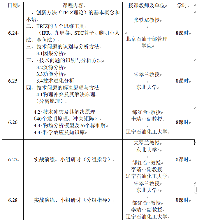 課程內(nèi)容涵蓋TRIZ理論體系、創(chuàng)新思維及創(chuàng)新案例分組指導(dǎo)及研討等。具體課程安排如下: