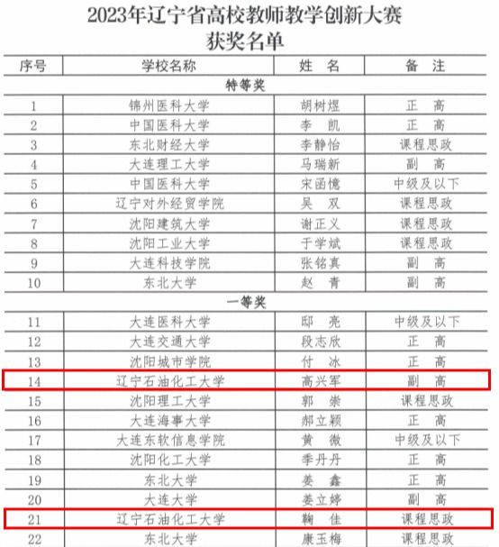 日前,遼寧省教育廳發(fā)布《遼寧省教育廳關(guān)于公布2023年遼寧省高校教師教學創(chuàng)新大賽獲獎名單的通知》遼教通〔2023〕146號,我校教師榮獲一等獎2項,二等獎3項,三等獎7項;學校獲得遼寧省高校教師教學創(chuàng)新大賽優(yōu)秀組織獎。