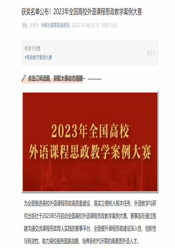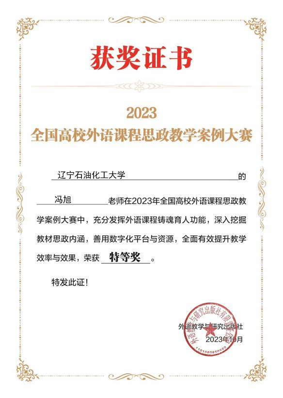 10月8日,在外研社舉辦的“2023年全國(guó)高校外語(yǔ)課程思政教學(xué)案例大賽”中,我校外國(guó)語(yǔ)學(xué)院教師馮旭表現(xiàn)優(yōu)異,從全國(guó)來自300多所高校的1773名參賽選手中脫穎而出,斬獲全國(guó)特等獎(jiǎng)的殊榮。