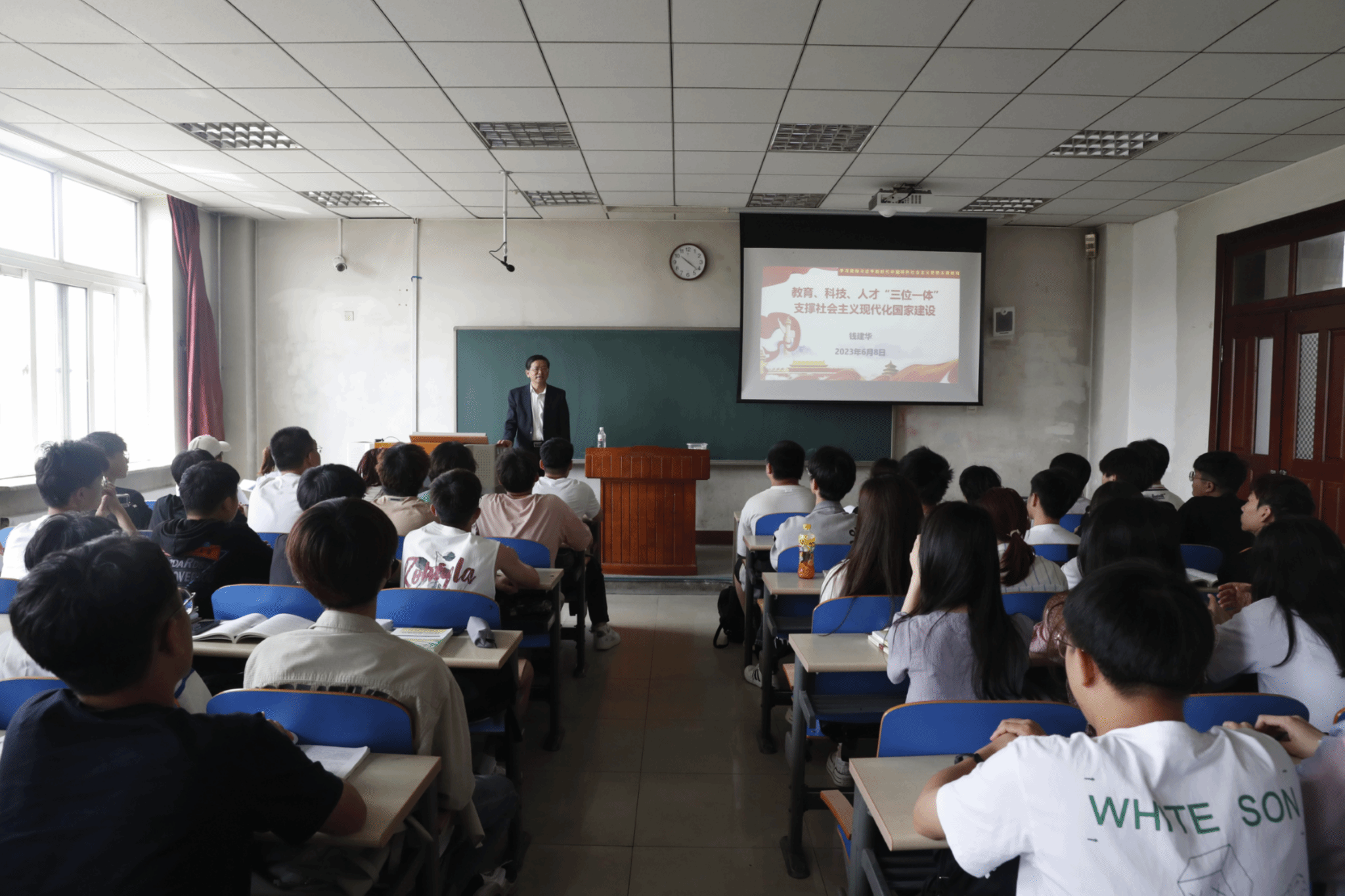 為推動學(xué)習(xí)貫徹習(xí)近平新時代中國特色社會主義思想主題教育走深走實,促進習(xí)近平新時代中國特色社會主義思想在青年學(xué)生中落地生根、開花結(jié)果,增強學(xué)校思想政治教育的實效性,6月8日上午,校長錢建華走進思政課堂,以“教育、科技、人才‘三位一體’支撐社會主義現(xiàn)代化國家建設(shè)”為主題,在教四B305為化卓2201-02、高卓2201-02班本科生講授主題教育專題“形勢與政策”課。