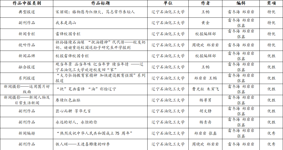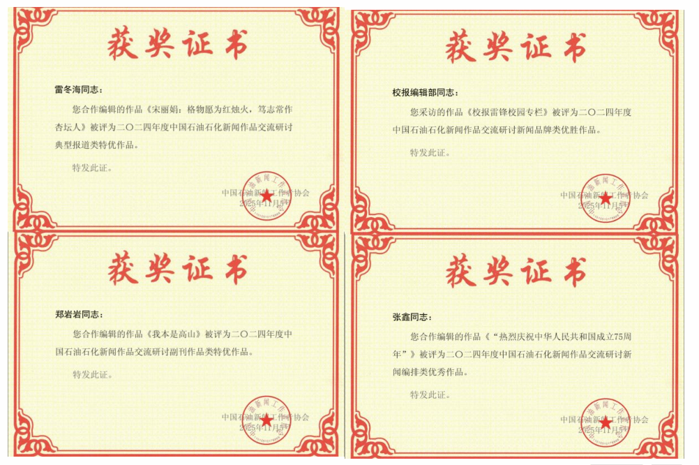 近日,中國(guó)石油新聞工作者協(xié)會(huì)公布了2024年度中國(guó)石油石化優(yōu)秀新聞作品研討交流結(jié)果。由我校校報(bào)編輯部撰寫、編輯、選送的13件新聞作品在石油院校類賽道中獲獎(jiǎng),其中特優(yōu)作品4件、優(yōu)勝作品7件、優(yōu)秀作品2件,實(shí)現(xiàn)校報(bào)近年獲獎(jiǎng)質(zhì)量與數(shù)量的雙重突破,創(chuàng)下歷史同期最佳成績(jī)。