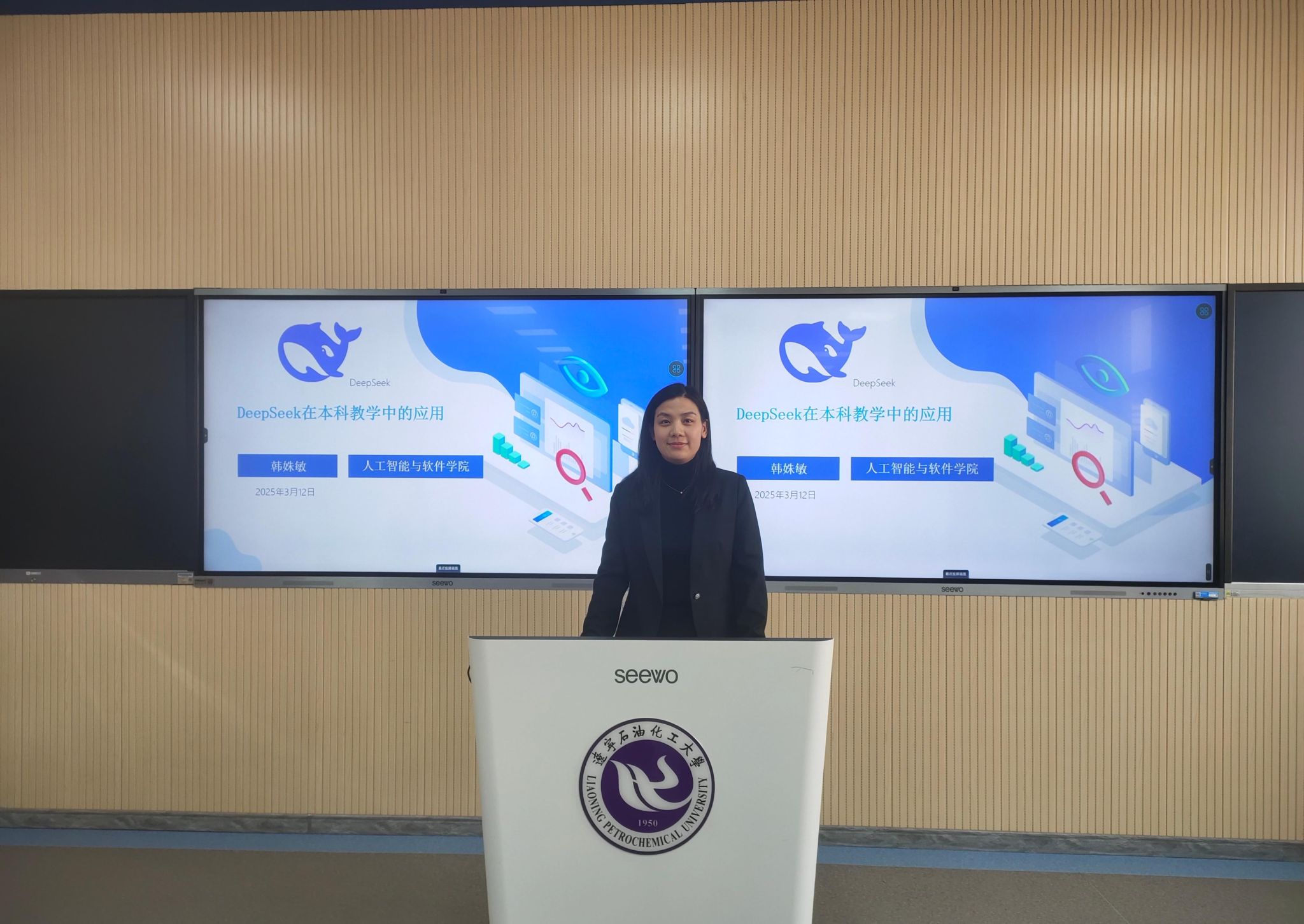 研討會(huì)分為“理論學(xué)習(xí)和實(shí)踐應(yīng)用”“分組研討”兩個(gè)環(huán)節(jié)。在第一個(gè)環(huán)節(jié),人工智能與軟件學(xué)院副院長(zhǎng)韓姝敏以“DeepSeek在本科教學(xué)中的應(yīng)用”為題,從“人工智能發(fā)展簡(jiǎn)史、人工智能思維、人工智能的前沿、AIGC應(yīng)用與實(shí)踐”四個(gè)方面向參會(huì)教師做了報(bào)告。韓姝敏簡(jiǎn)要介紹了人工智能的誕生歷史、發(fā)展過(guò)程、什么是DeepSeek、DeepSeek模型及其優(yōu)勢(shì),并以自己親身實(shí)踐詳細(xì)介紹了“如何將DeepSeek和其他工具結(jié)合起來(lái)優(yōu)化教學(xué)方案與課程設(shè)計(jì)、編寫(xiě)工程案例、設(shè)計(jì)互動(dòng)小程序、構(gòu)建知識(shí)圖譜、生成PPT、構(gòu)建數(shù)字人”等應(yīng)用案例,講解內(nèi)容豐富、可操作性強(qiáng),為廣大教師應(yīng)用提供了極有價(jià)值的參考范例。