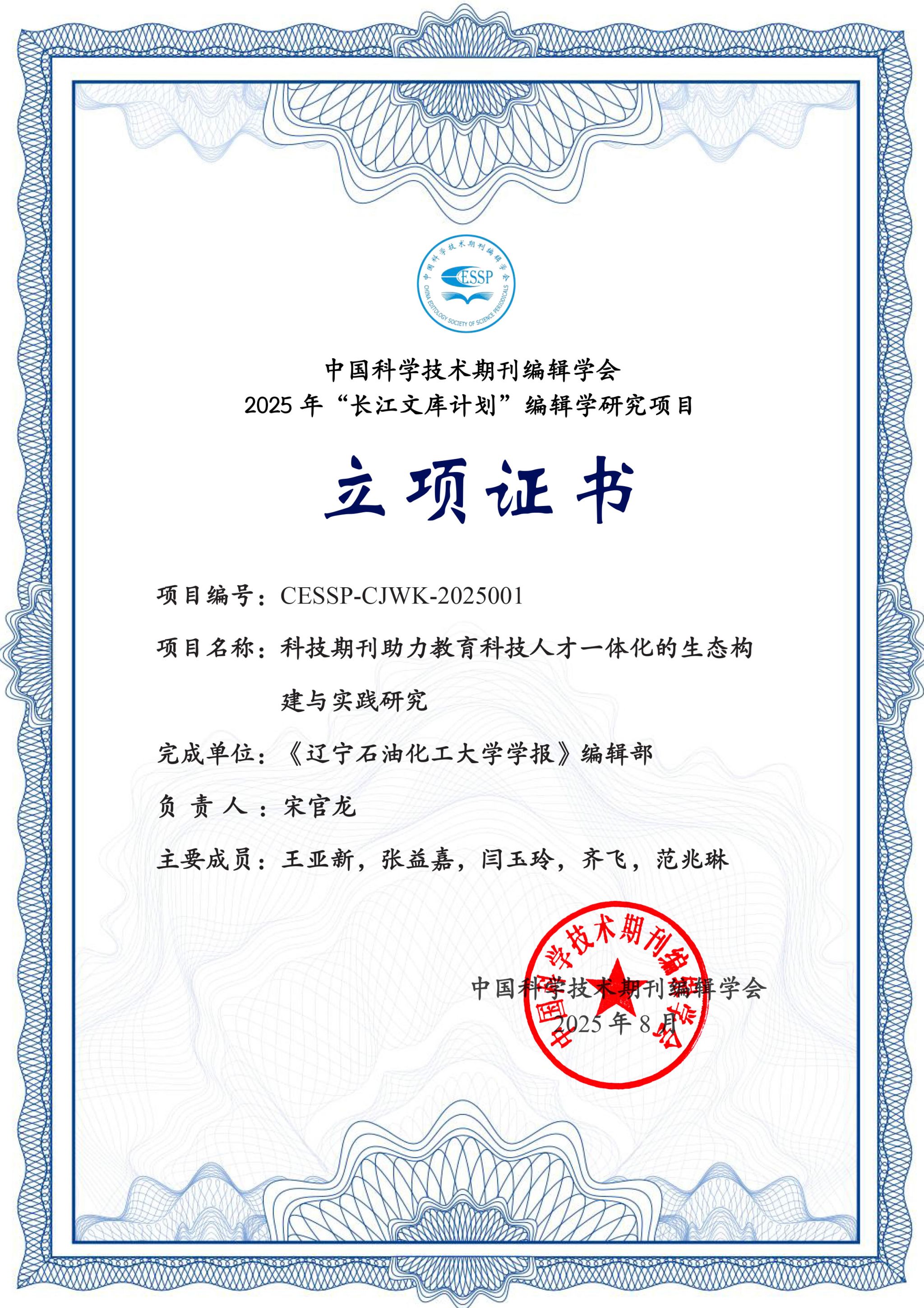 我校學(xué)報(bào)編輯部宋官龍編輯主持申報(bào)的“科技期刊助力教育科技人才一體化的生態(tài)構(gòu)建與實(shí)踐研究”,獲批中國科技期刊編輯學(xué)會2025年“長江文庫計(jì)劃”編輯學(xué)研究重點(diǎn)項(xiàng)目(項(xiàng)目編號:CESSP-CJWK-2025001)。據(jù)悉,中國科學(xué)技術(shù)期刊編輯學(xué)會“2025年‘長江文庫計(jì)劃’編輯學(xué)研究項(xiàng)目”共54項(xiàng),其中重點(diǎn)項(xiàng)目6項(xiàng),一般項(xiàng)目24項(xiàng),自籌項(xiàng)目24項(xiàng)。
