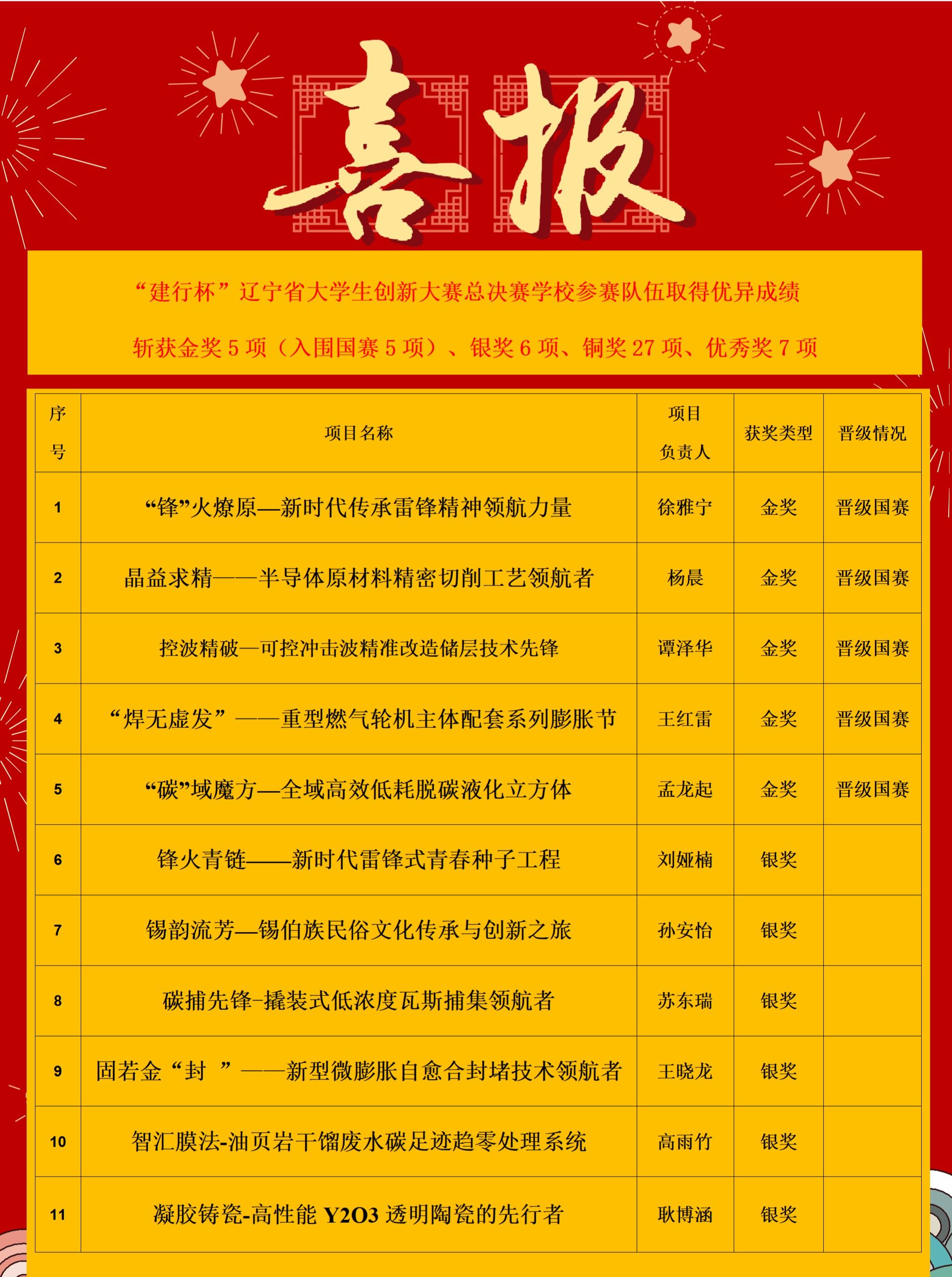 近日,“建行杯”遼寧省大學生創新大賽總決賽暨中國國際大學生創新大賽(2025)遼寧賽區決賽圓滿落幕。我校在此次大賽中表現卓越,共斬獲省金獎5個、銀獎6個、銅獎27個、優秀獎7個,取得了優異成績。“晶益求精——半導體原材料精密切削工藝領航者”等5個參賽項目獲得金獎并全部入圍國賽,涵蓋高教主賽道、“青年紅色筑夢之旅”賽道、產業賽道三個賽道,充分展現了我校參賽項目的高質量與覆蓋的廣泛性。晉級國賽數量取得了我校該項賽事的新突破。