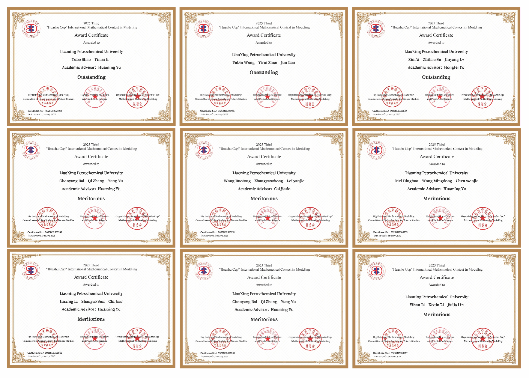近日,經“華數杯”國際大學生數學建模競賽專家組初評、復評、會評和最終審核四個階段的嚴格評審,組委會公示了2025年“華數杯”國際大學生數學建模競賽獲獎成績。我校學子榮獲國家級Outstanding獎(特等獎)3項、Meritorious(一等獎)7項、Honorable Mention(二等獎)15項、Successful Participant(優秀獎)34項,創歷史佳績。