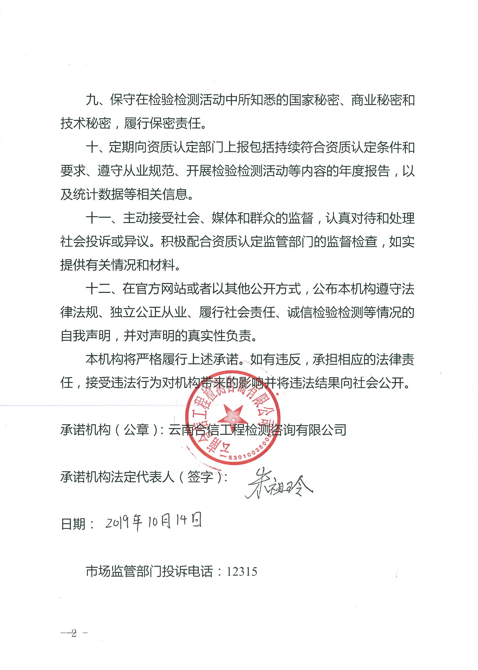 云南省檢驗檢測機構質量誠信承諾書