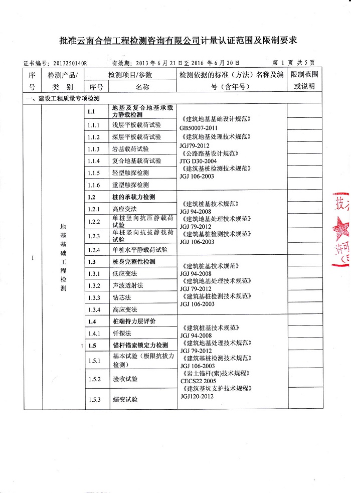 云南合信工程檢測咨詢有限公司地基基礎工程檢測主要能力為