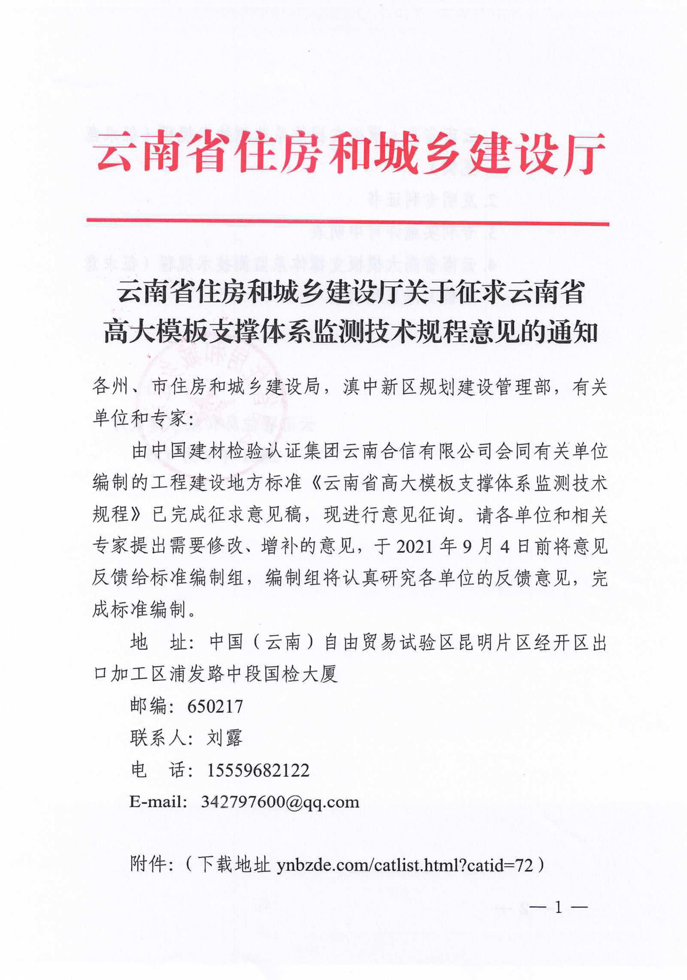 云南省住房和城鄉建設廳關于征求云南省高大模板支撐體系監測技術規程意見的通知