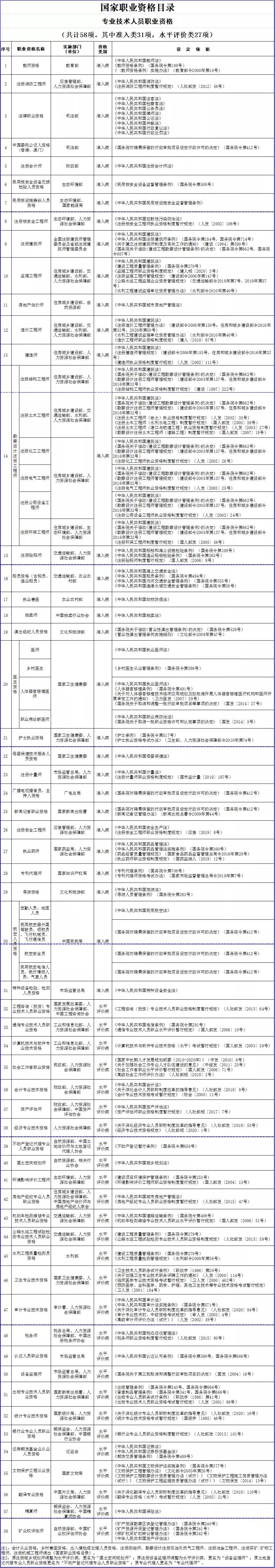 為貫徹落實國務院“放管服”改革要求,結合近年來國務院有關部門職責調整、行政審批事項改革等情況,擬對2017年公布的《國家職業資格目錄》專業技術人員職業資格部分進行調整。調整后,擬列入專業技術人員職業資格58項,其中,準入類31項,水平評價類27項?,F將調整后的《國家職業資格目錄(專業技術人員職業資格)》予以公示,公示期7天。如有意見建議,請于2021年1月19日之前將署名意見建議反饋至郵箱zjszhichengchu@163.com。