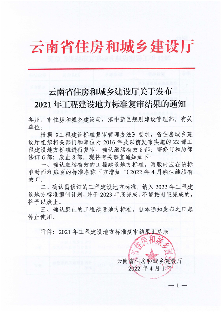 云南省住房和城鄉建設廳關于發布2021年工程建設地方標準復審結果的通知