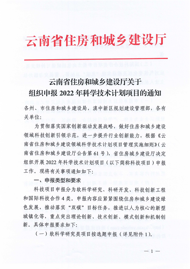 云南省住房和城鄉(xiāng)建設(shè)廳關(guān)于組織申報2022年科學(xué)技術(shù)計劃項目的通知