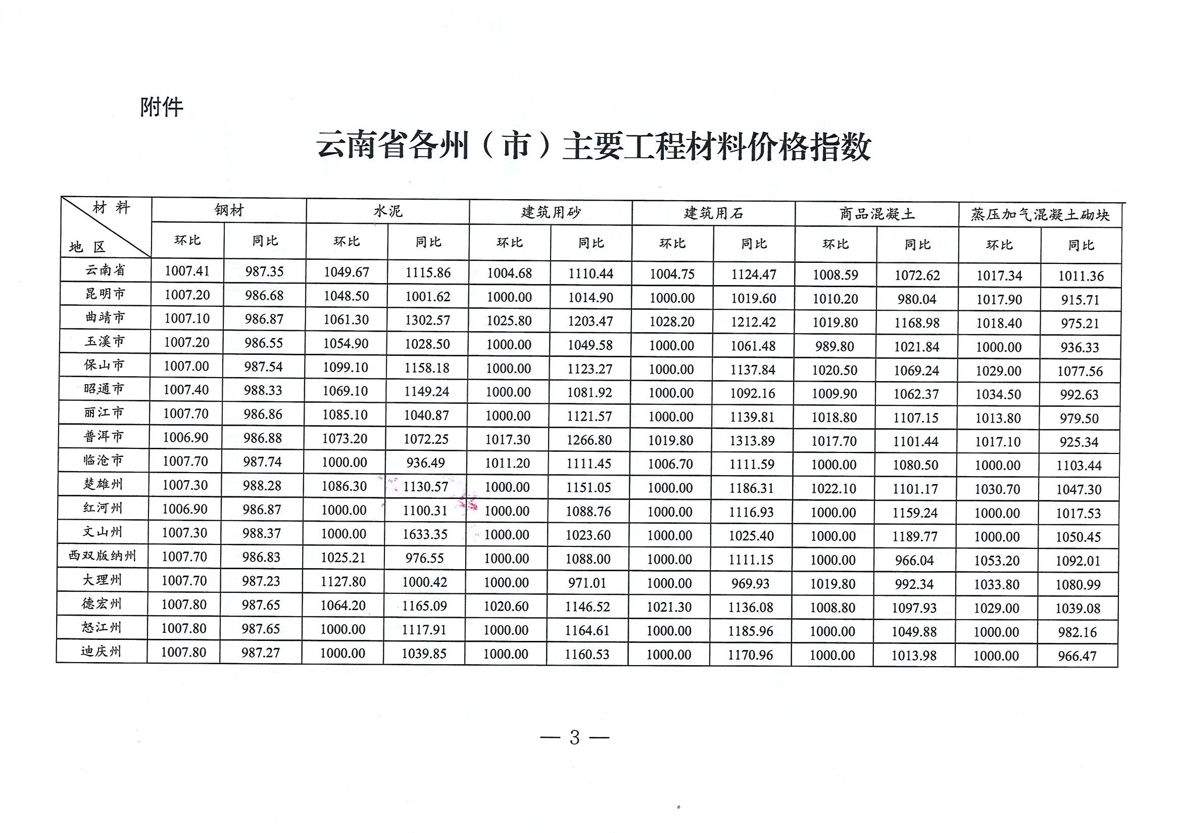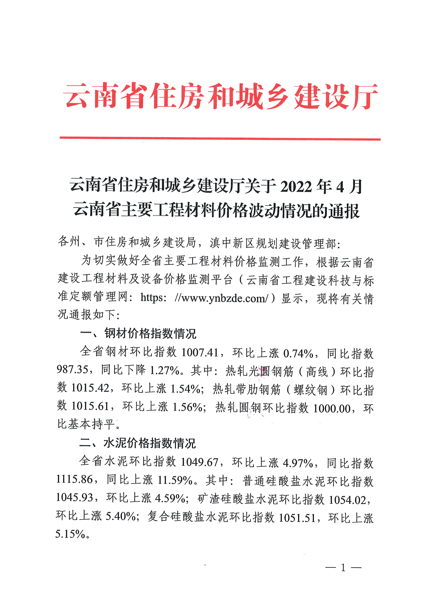 云南省住房和城鄉(xiāng)建設(shè)廳關(guān)于2022年4月云南省主要工程材料價格波動情況的通報