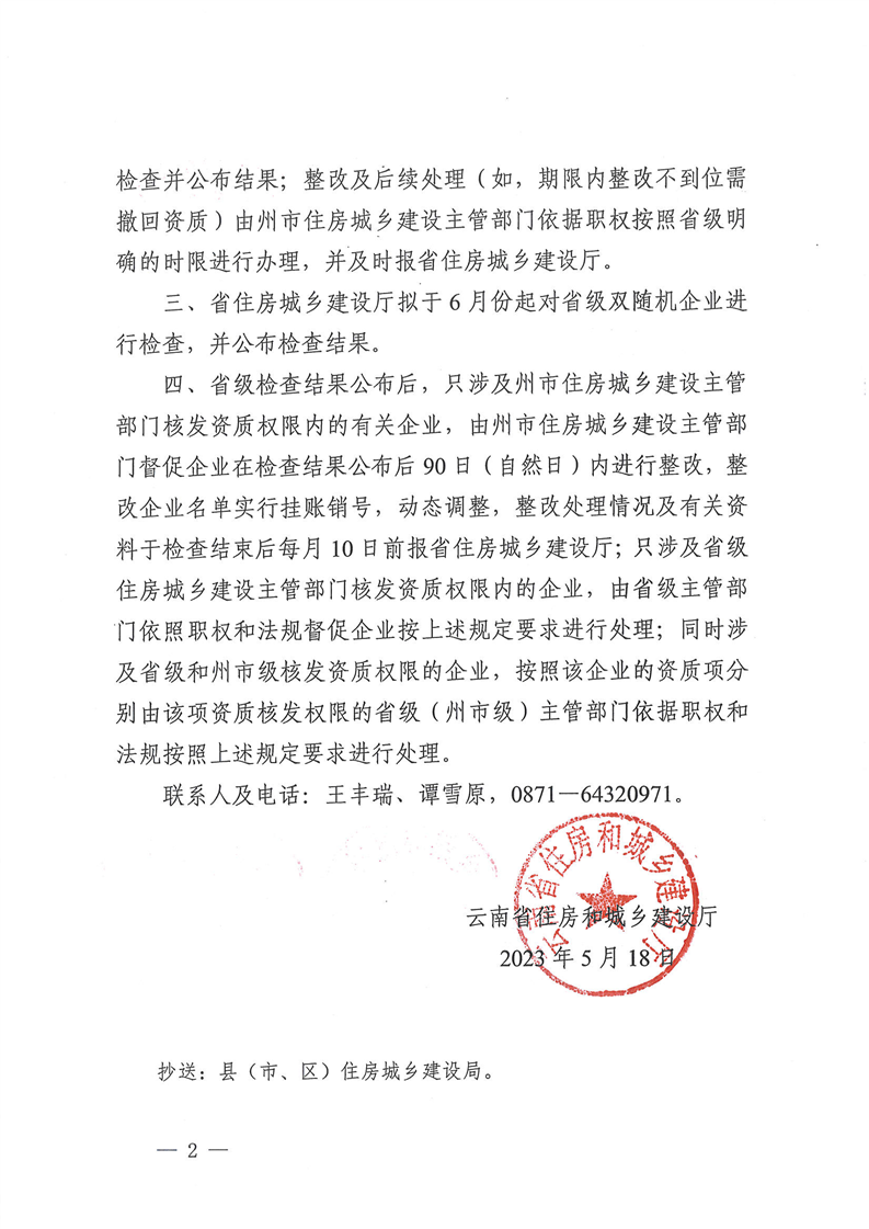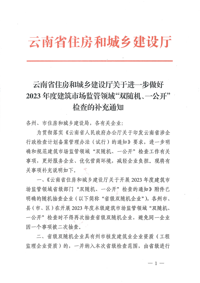 云南省住房和城鄉(xiāng)建設(shè)廳關(guān)于進一步做好2023年度建筑市場監(jiān)管領(lǐng)域“雙隨機、一公開”檢查的補充通知